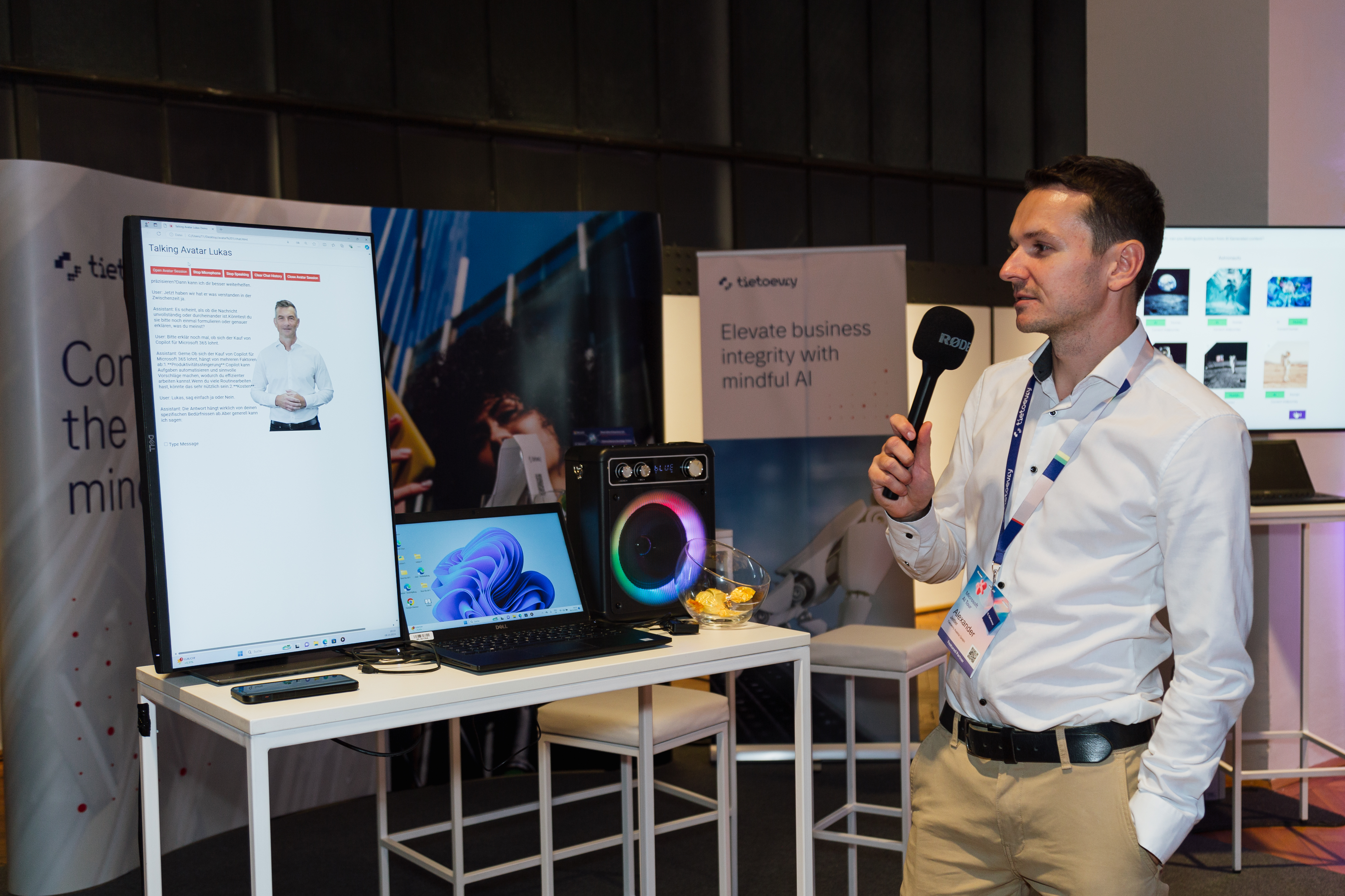 An unserem Messestand haben wir unsere neuen Tietoevry GenAI-Lösungen präsentiert und live gezeigt, wie diese in die bestehenden Geschäftsprozesse von Kundenunternehmen integriert werden können, um die betriebliche Effizienz zu steigern und das Datenmanagement zu verbessern.