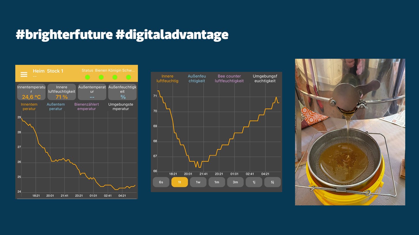 Ein sehr großer Bereich meines täglichen Arbeitens befasst sich mit Internet of Things (IoT), künstliche Intelligenz und weiteren spannenden Digitalisierungsthemen. Natürlich mussten aus meiner beruflichen Passion heraus gleich ein paar Sensoren in meine Bienenstöcke. Neben (Innen-) Temperatur, Luftfeuchtigkeit, Ton / Schall wird / kann auch das Gewicht kontinuierlich gemessen und ausgewertet werden. Man kann hier einige Daten ziehen und damit Aussagen über Gesundheitszustand, Schwarm Vorhersage, Zunahme des Honigeintrages liefern. Ein weiteres interessantes Detail zeigt sich mit der Erkenntnis, ob im Winter noch genug Futter im Stock ist. Ebenso gibt es Ansätze hier Bestäubungsleistungen für den Ackerbau zu berechnen. So kann zum Beispiel ermittelt werden, wie viele Bienenstöcke muss ich aufstellen, um somit XY % mehr Ertrag zu erwirtschaften. Digitalisierung schafft damit in Punkto Nachhaltigkeit einen direkten sichtbaren Outcome.
