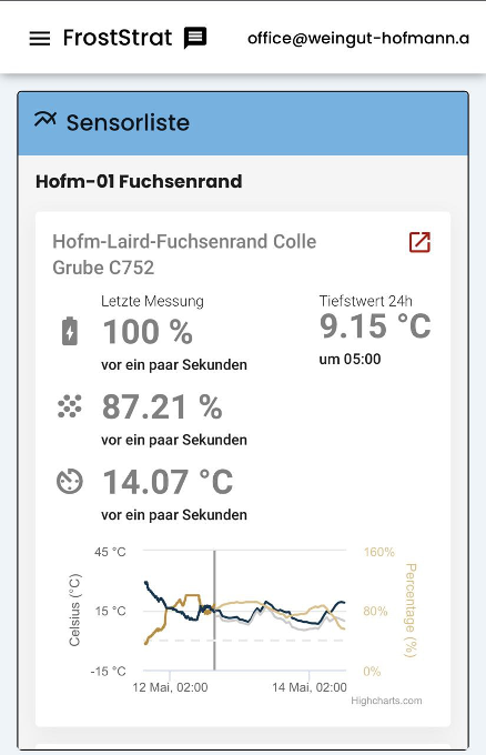 Alle gewonnenen Daten, Prognosen und auch Handlungsempfehlungen sind in Echtzeit über Desktop oder Handy abrufbar, und die teilnehmenden Betriebe werden proaktiv via SMS oder E-Mail vor sinkenden Temperaturen gewarnt. Leo Müller vom Weingut Müller hebt diesen Aspekt bei seinem Rückblick auf die Wirksamkeit von FrostStrat hervor: „Durch die mobile Verfügbarkeit der Daten können wir jederzeit und vor allem rechtzeitig Kaltluftströme erkennen und sofort gezielt Maßnahmen setzen. Dies hilft uns dabei mögliche Frostschäden frühzeitig einzudämmen oder vollständig zu vermeiden.“
