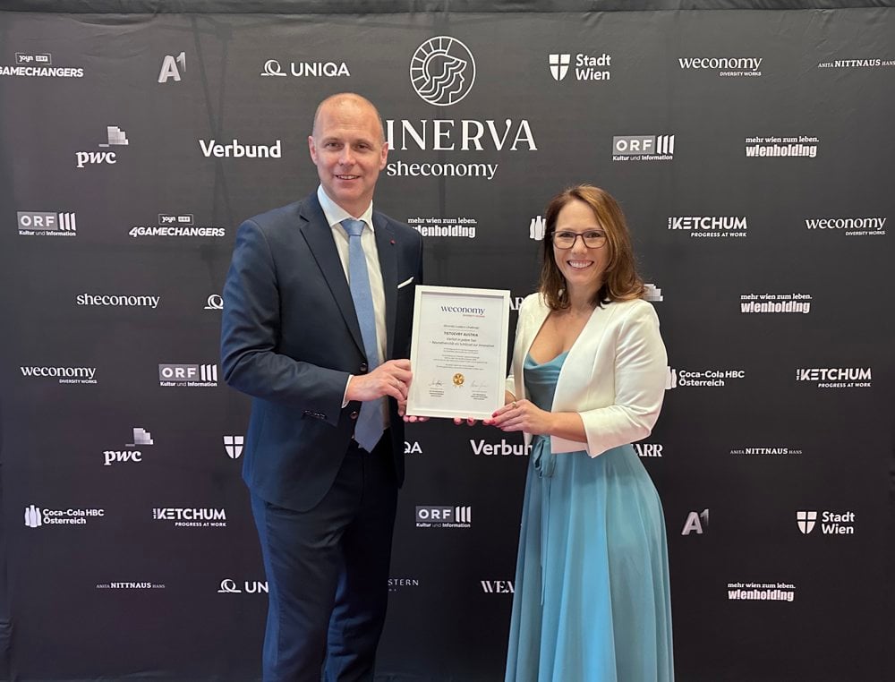 Foto 1 v.l.n.r.: Robert Kaup (Managing Director Tietoevry Austria und Head of New Markets bei Tietoevry Create) und Cornelia Samec (Operations Lead New Markets und DEI Lead Austria bei Tietoevry Create) mit der Urkunde für den Minerva-Award 2025 © Tietoevry