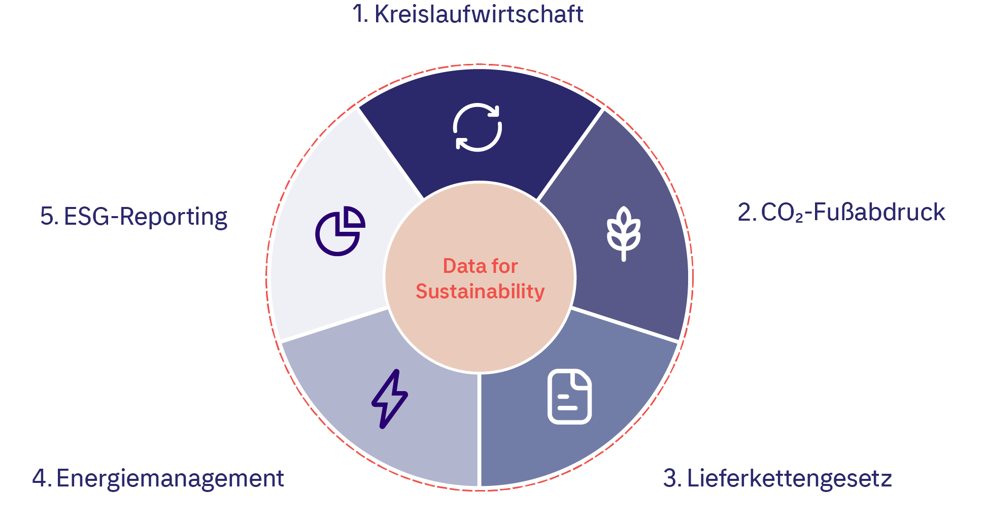 Dank „Data for Sustainability“ können Unternehmen den Verbrauch von Ressourcen wie Energie und Wasser optimieren oder die Umweltauswirkungen überwachen und Umweltschutzmaßnahmen verbessern, sowie gesetzlichen Auflagen nachkommen (ESG-Reporting). Sie können mithilfe von Daten ihre Lieferketten nachverfolgen und sicherstellen, dass sie ethische und umweltfreundliche Praktiken verwenden.