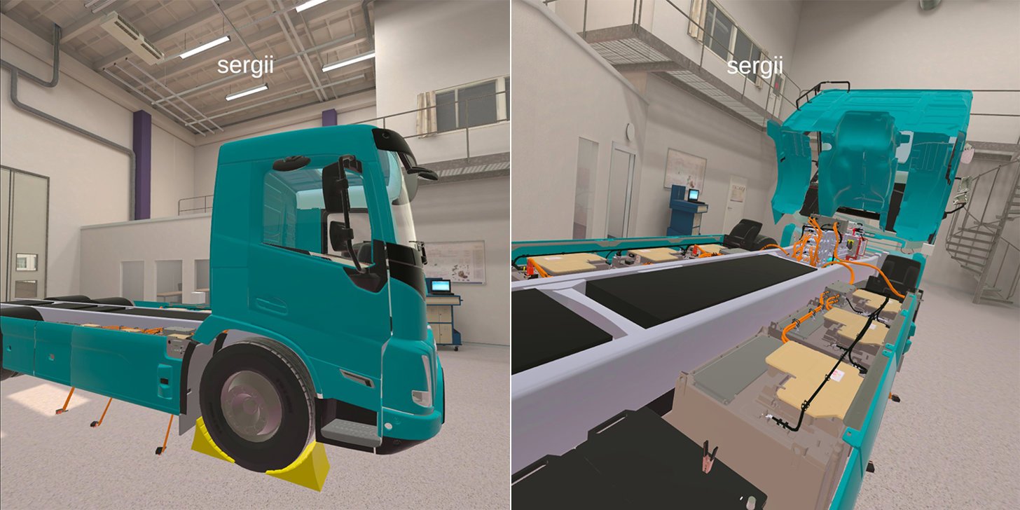 - Techniker können nicht nur mit einem Schulungsstand interagieren, sondern mit virtuellen Modellen ganzer Fahrzeuge, einschließlich des neuen Elektro-Lkw-Modells des Kunden, sowie Muldenkippern, Kühlschränken usw.