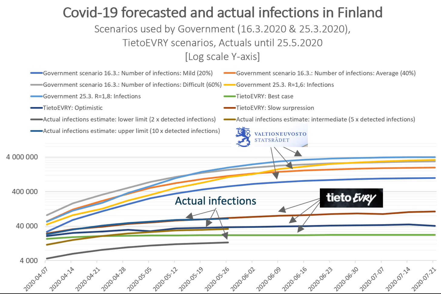 These projections include the effects of emergency slowdown measures. In the table, we see how the predictions determined by TietoEVRY's logarithmic scale follow quite closely the current estimates of the total number of infections.