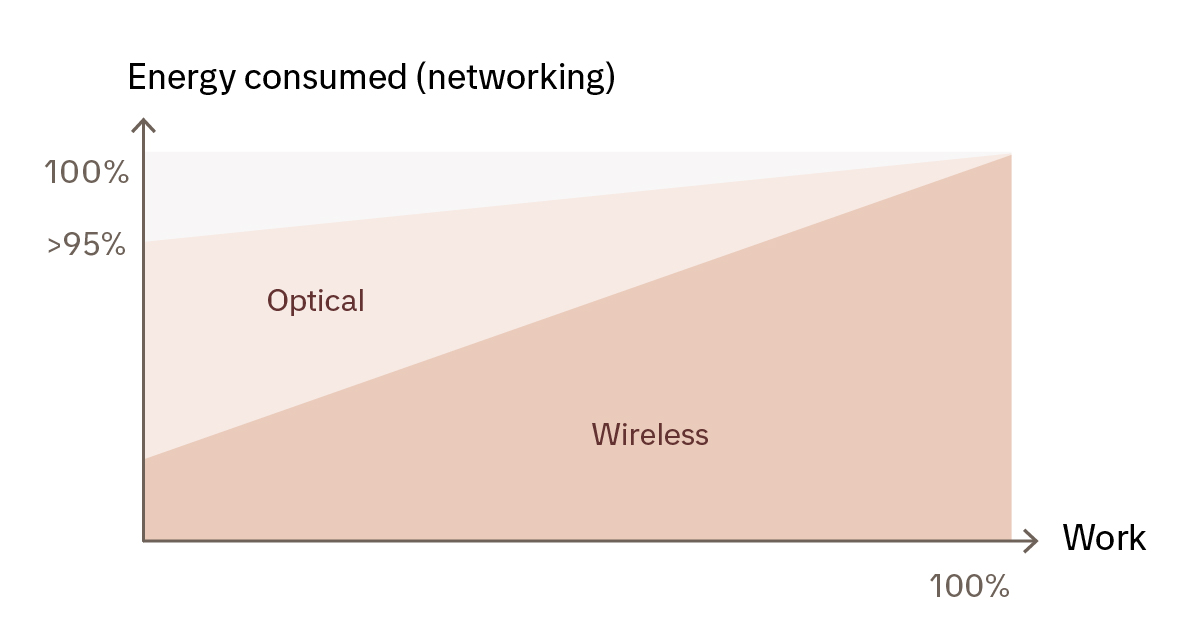 For networking, the correlation is even less prominent, with for example, optical equipment being basically flat. For wireless networking the proportionality is more like servers. The relationship between “work” and energy consumed in case of networking is per network node (illustrated in the diagram below). It implies that if the network needs to be densified so that the number of nodes increases, the energy consumed for the entire network goes up. In other words, networking on a wide area highlights the ratio that is not exposed by individual nodes under such preconditions.