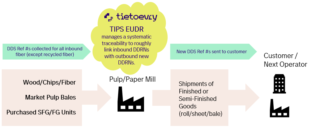 Tietoevry’s TIPS is a leading Manufacturing Execution System (MES) for the pulp, paper, and fibre industries. Our new EUDR module can be simply added to a mill’s IT landscape and configured to handle different methodologies of customer compliance.