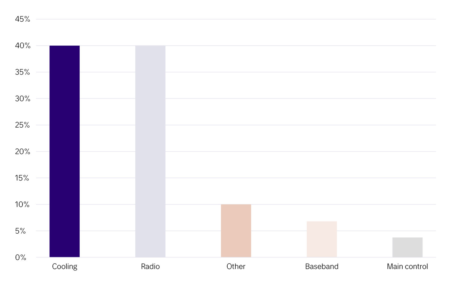So, what makes up those 70-80%? And how does it scale? According to an NGMN study, the consumed energy can be broken down into categories, where Cooling and Radio take the leading positions in consumption.
