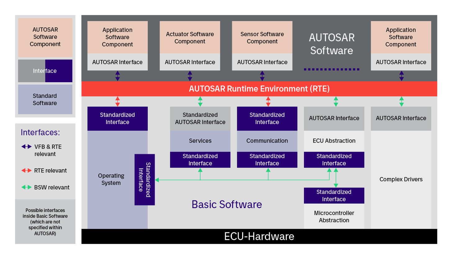 In the early 2000s, it was clear that upgrading or changing hardware platforms becomes challenging due to the dependencies, so vendors would often implement their own hardware abstraction layers (HALs) as foundational layers for the drivers. Having a set of broadly used microcontroller units and microprocessors, a group of automotive manufacturers and suppliers along with electronics and semiconductor producers founded the Automotive Open System Architecture (AUTOSAR) in 2003. AUTOSAR’s primary objective is to develop a standardized software architecture for automotive electronic control units (ECUs) and enable open E/E systems that will foster intelligent mobility. The organization provides specifications for basic software modules, standardized interfaces, and a common development methodology that can be used in vehicles from different OEMs with diverse electronic components.