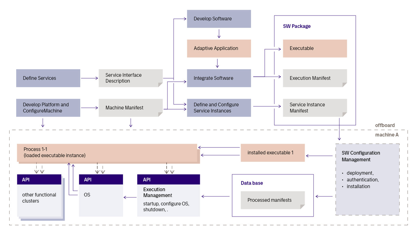 When utilizing AUTOSAR Adaptive, software architects create definitions for the services, which then generate C++ interfaces that have to be implemented. During the later development phase, new protocol-specific code components are created so that the engineering teams are independent of the future network communication layer.