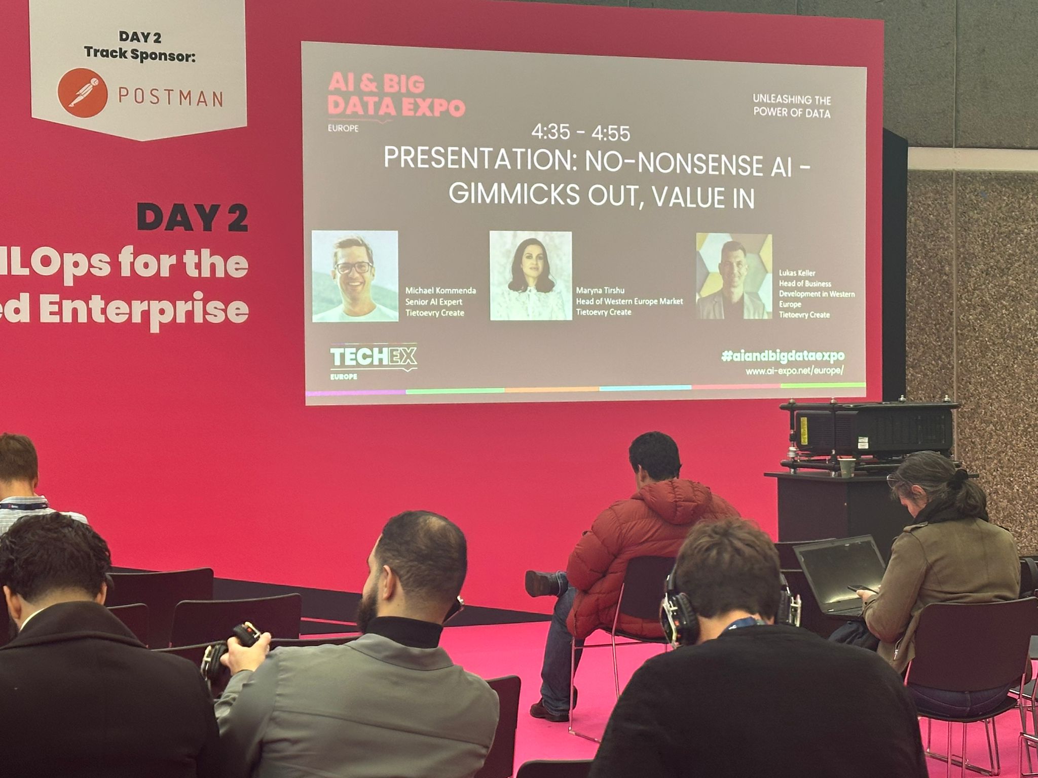 We debuted with a booth at the AI & Big Data Expo, part of TechEx, and presented “No-nonsense AI” – AI that is scalable, delivers only what your business needs, and is gimmick-free. The Tietoevry Create AI.
