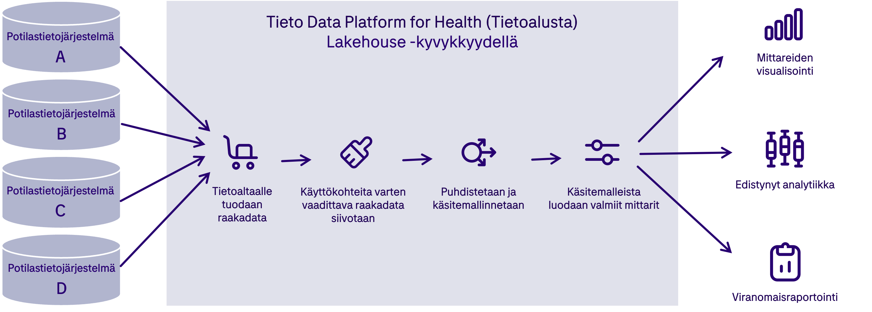 Tietoalustalle rakentuva Lakehouse vastaa mainiosti myös pirstaleisuuden haasteeseen. Kaikki data integroidaan yhteiselle alustalle, josta se on hyödynnettävissä ilman erillistä kopiota tiedosta. Lakehousen myötä olemme päässeet tilanteeseen, jossa teknologia ja työkalut eivät ole enää suurin haasteemme, vaan keskitymme niiden ympärille oikeaan organisoitumiseen.