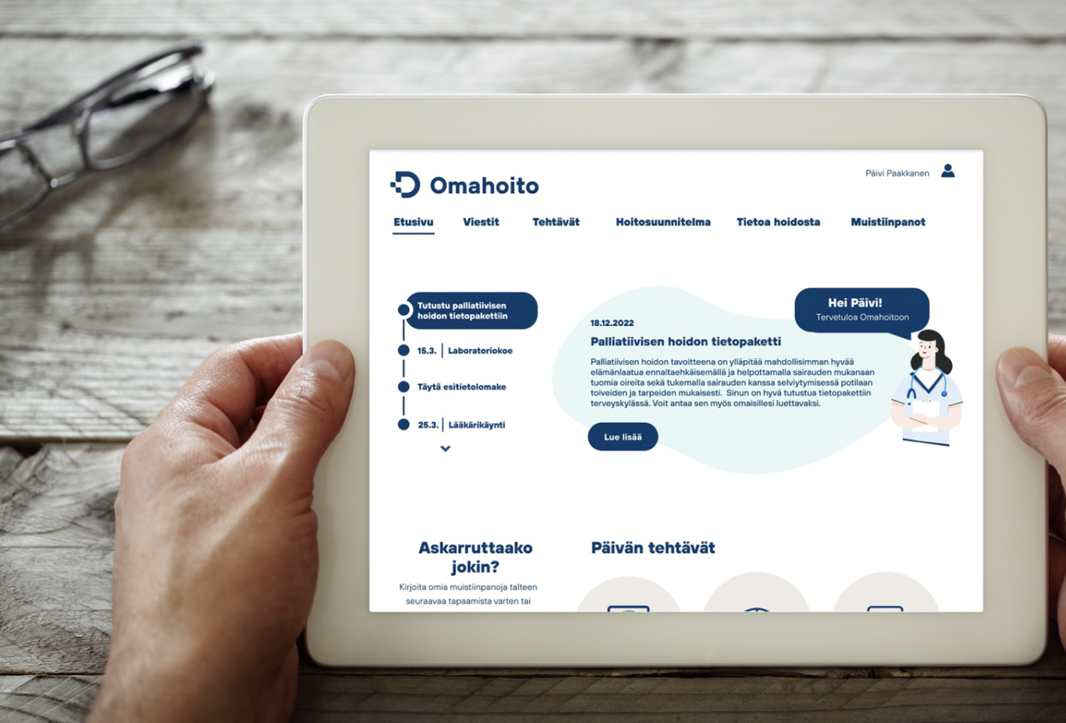 Vuosittain 30 000 suomalaista tarvitsee palliatiivista hoitoa, sillä heidän sairauttaan ei voida parantaa. Hoidolla vähennetään kärsimystä ja vaalitaan elämänlaatua loppuun saakka. Palvelumuotoilimme digitaalisen hoitopolun tukemaan mahdollisuutta parempaan loppuelämään digitalisaation keinoin.