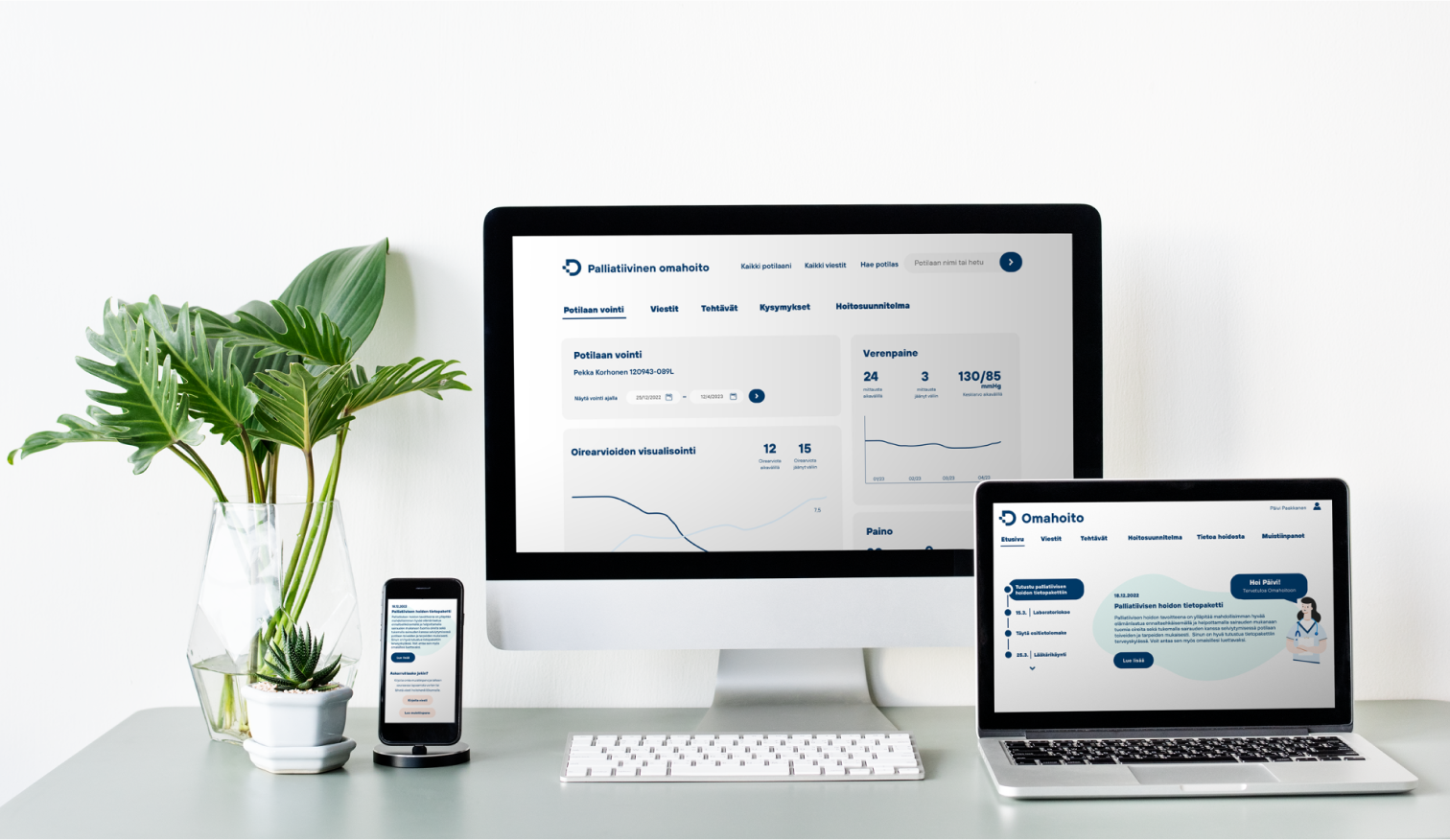 Potilaan digipalvelussa keskeistä oli tuoda uusi kanava viestintään, jota hän voisi hyödyntää muissa kuin kiireellisissä asioissa oman aikataulun mukaan. Viestintä suunniteltiin henkilökohtaiseksi - ammattilaiset viestivät aina omilla nimillään ja kasvoillaan. Samalla potilasta haluttiin aktivoida seuraamaan omaa vointiaan. Palliatiivisen potilaan kontrollikäyntien välissä voi hyvin mennä muutama kuukausi. Kun potilas tekee säännöllisesti vointia monitoroivia tehtäviä, näkee hoitohenkilökunta etänä miten potilaan vointi on kehittymässä. Tämä tarkoittaa, että huonosti voiva potilas osataan kutsua suunniteltua nopeammin vastaanotolle, ja hyvävointista ei juoksuteta siellä turhaan.