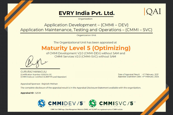 EVRY India is appraised to maturity level 5 for both CMMI DEV and CMMI SVC frameworks (multi-model) V2.0