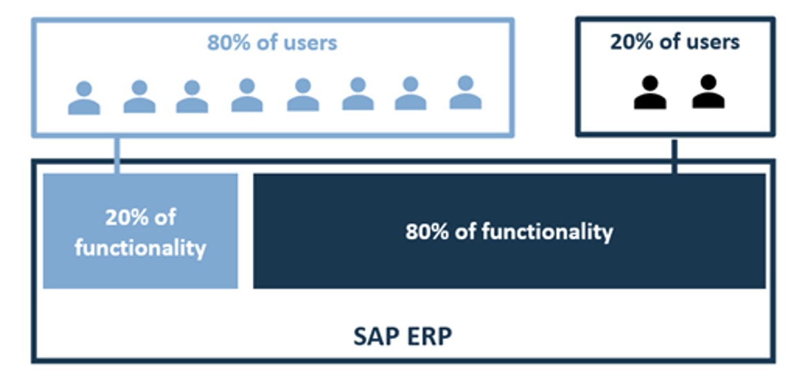 Attiecībā uz daudzām SAP ERP sistēmām ir spēkā 80:20 likums – 80 % lietotāju izmanto tikai 20 % funkciju, savukārt atlikušie 20 % izmanto vairumu (80 %) funkciju.