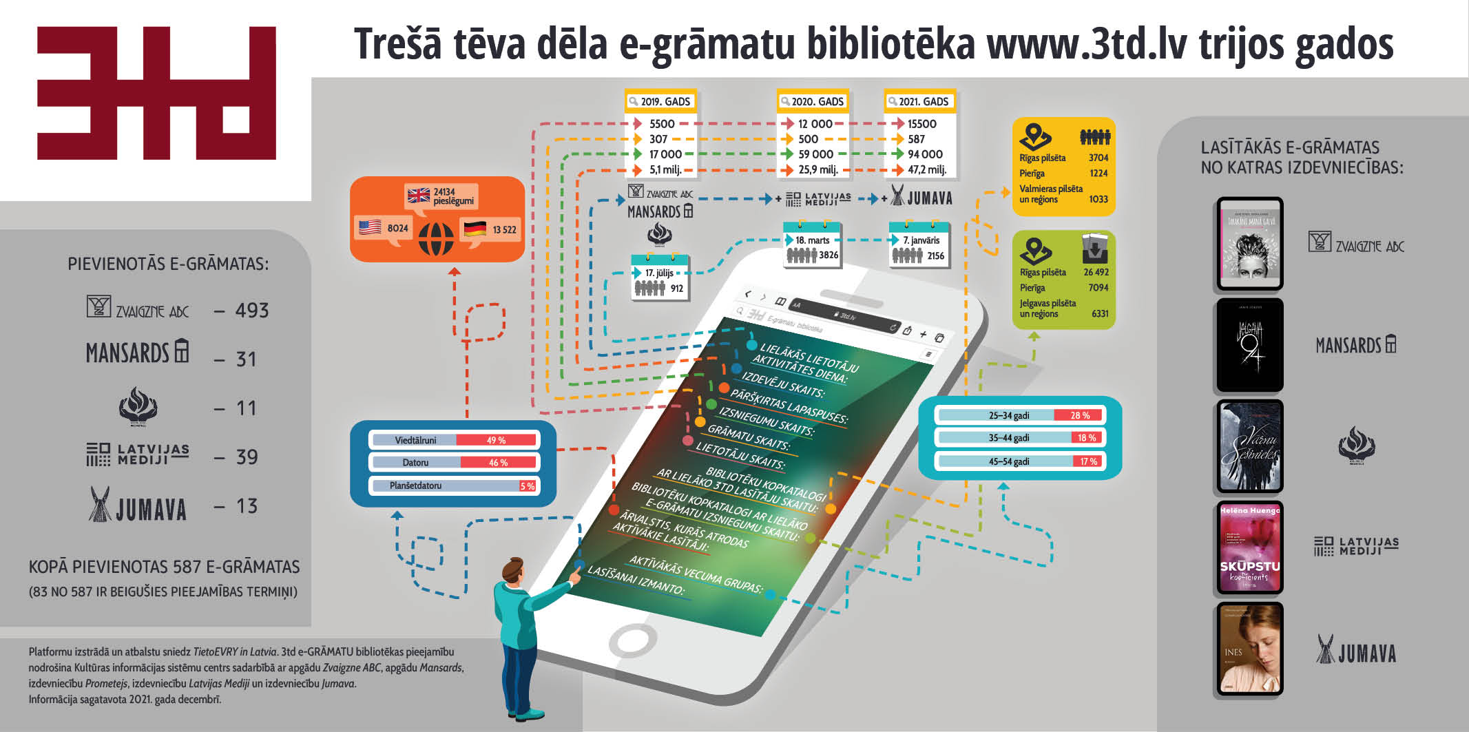 Kopš 2019. gada, kad tika atklāta e-grāmatu bibliotēka platformā www.3td.lv, aktīvo lietotāju skaits pirmā darbības gada beigās bija 5500, savukārt 2021. gadā lasītāju pieaugums ir teju trīskāršojies, sasniedzot gandrīz 16 000. No tiem aptuveni puse jeb 49% lietotāju saturu izvēlas patērēt viedtālrunī, bet nedaudz mazāk jeb 46% cilvēku e-grāmatas lasa datorā.