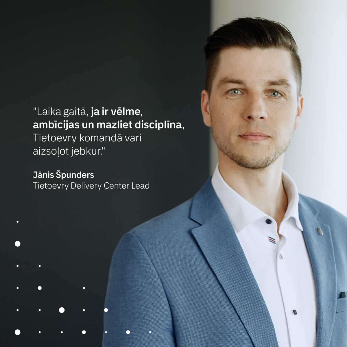 Patstāvīgi pildot uzticētos pienākumus, viņš vēlāk turpināja izaugsmi “Tietoevry” kā jaunāko speciālistu komandas vadītājs. “Laika gaitā, ja ir vēlme, ambīcijas un mazliet disciplīna, var aizsoļot jebkur,” atzīst Jānis. Tas viņam arī teicami izdevās, jo pēc laika Jānis kļuva par vadītāju dažādām komandām, sākot ar telefona jeb pirmās līnijas un citām atbalsta komandām. Paralēli notika arī jaunu klientu pārņemšana no Skandināvijas kolēģiem un klientu atbalsta ieviešana un nodrošināšana no Rīgas komandām. Šobrīd viņš ir “Tietoevry” Skandināvu IT pakalpojumu centra vadītājs. Jānis Rīgā vada cilvēkus, kuri atbild par šī centra komandām. Viņa atbildībā ir viss, kas saistīts ar Skandināvijas klientiem – gan cilvēkiem, gan pakalpojumiem, gan ietekmes pušu pārvaldību.