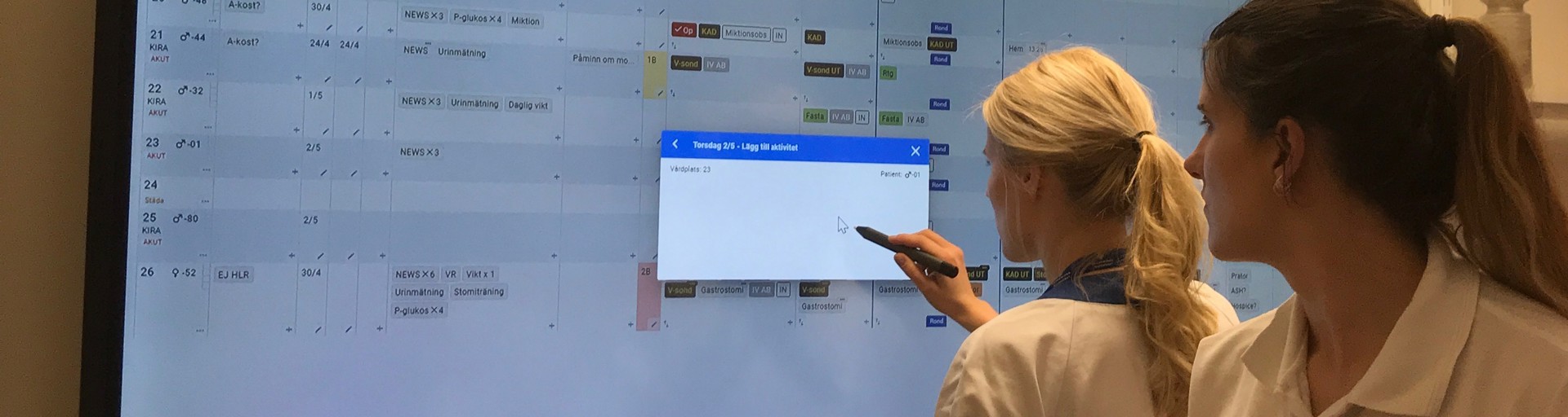 Alla uppdateringar som görs under dagen gällande en befintlig patient matas in direkt på tavlans touchskärm, personalen bockar av arbetsuppgifter eller sätter upp nya digitala magneter vartefter dagens arbetsuppgifter utförs. Alla får samma information momentant, oavsett var man befinner sig. Den digitala tavlan innebär en otrolig lättnad jämfört med den analoga whiteboard som användes tidigare, undersköterskor och sjuksköterskor har fått ett helt nytt kommunikationsverktyg, man behöver inte lägga lika mycket tid på överlämning och inläsning, man får en tydlig överblick över arbetsdagen och en automatisk bild av nuläget.